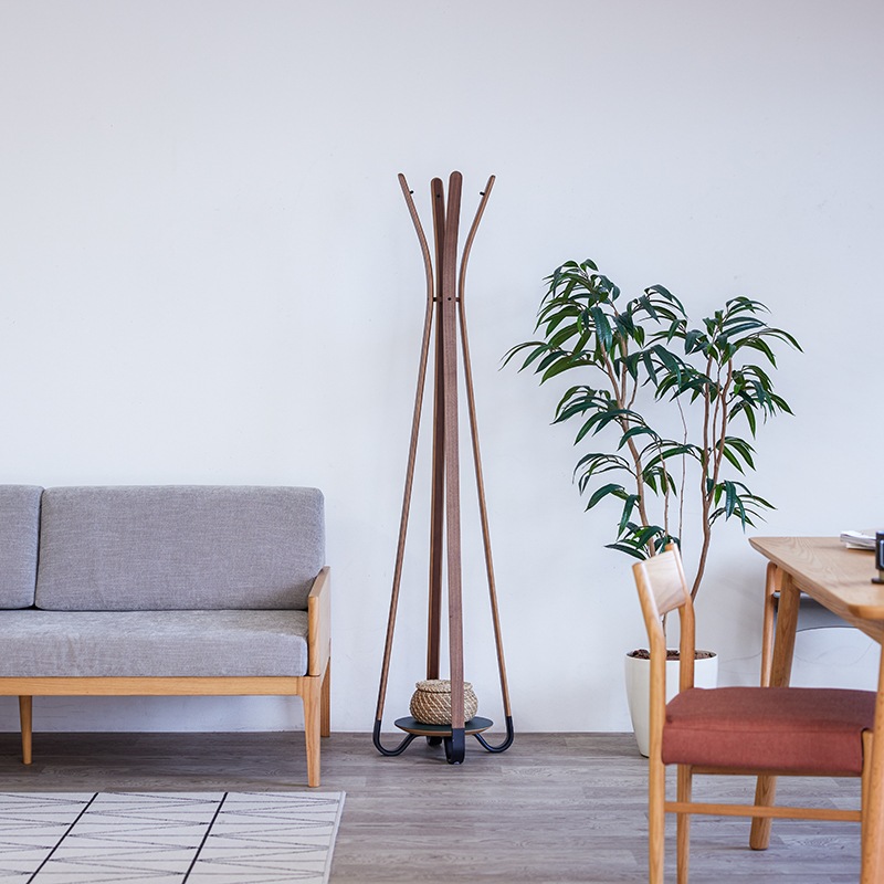 美しい花々のつぼみからインスピレーションを得てデザインされたコートハンガーです。コートや上着、帽子などを直接最上部に掛けたり、市販のハンガーを使って金属の突起部分に引っ掛けて衣服を収納します。下部にはリノリウムを使った小さな鞄やプランターを置くための棚板があり、物を置かない場合でもインテリアのポイントとなります。滑らかな曲線が連続したフォルムは、衣類を掛けていない状態でもオブジェとして美しく、美観と実用を兼ねた製品です。