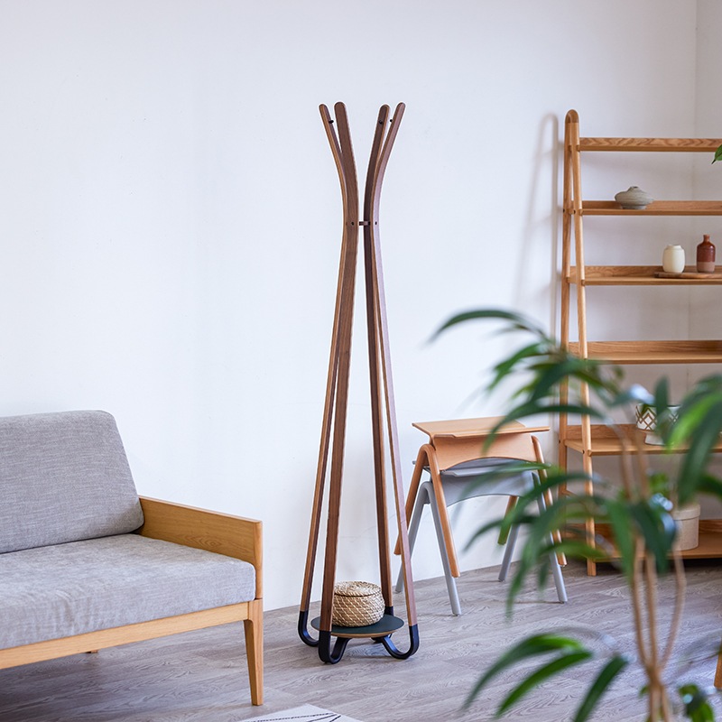 This coat hanger design is inspired by beautiful flower buds. Hang coats, jackets, hats, etc. directly on the topmost part, or use commercially available hangers and hook them onto the metal prongs to store clothes. At the bottom, there is a linoleum shelf for small bags or planters, and even if you don't place any objects on it, it will become a point of interest in your interior design. The continuous smooth curves of the form make it a beautiful objet d'art even when clothes are not hung on it, making it both aesthetically pleasing and practical.