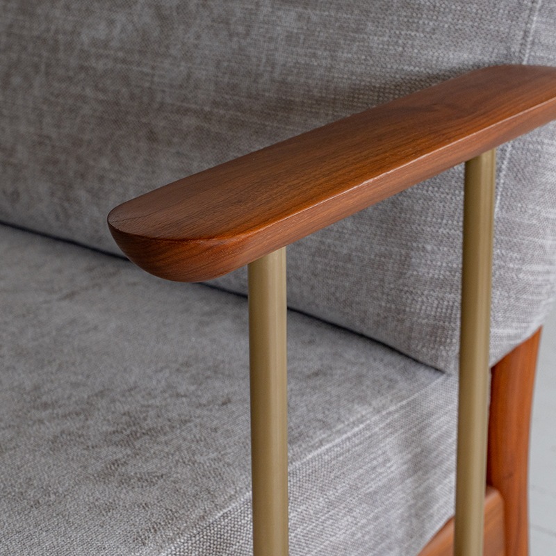 天然の無垢材と金属のコンビネーションによる彫刻的なアームと、背面に整然と並んだ円柱が特徴的なソファです。背面の見た目も美しく、背面を壁付けしないアイランド式の設置に適しています。