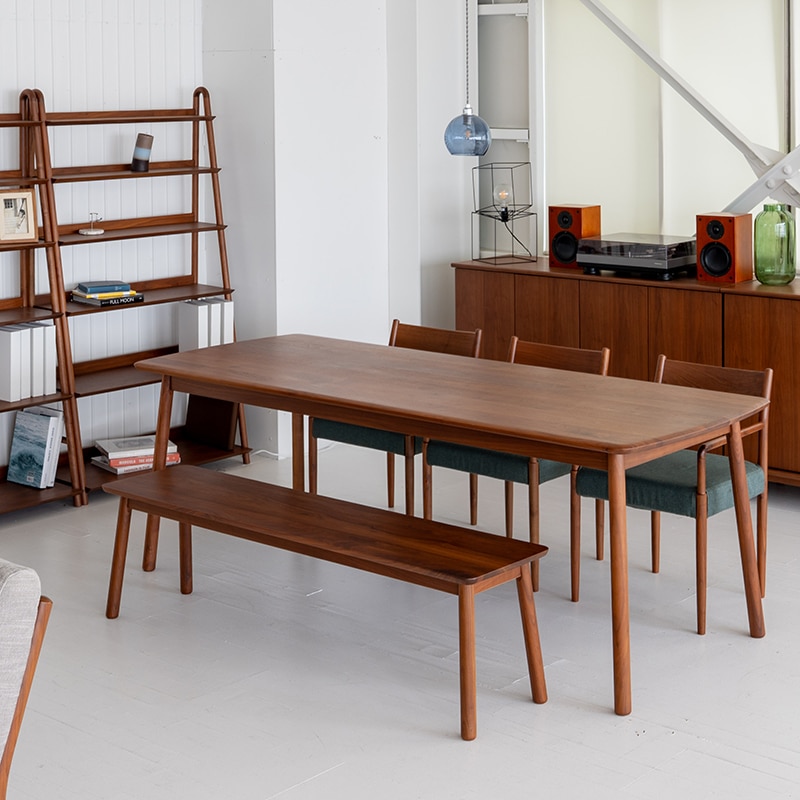 無垢材を削り出して作られた大きな円弧が特徴的な、ダイニングの中心に相応しい存在感のあるテーブルです。流線型に削られた天板小口は、腕への圧迫力を軽減するため、長時間の使用にも適しています。