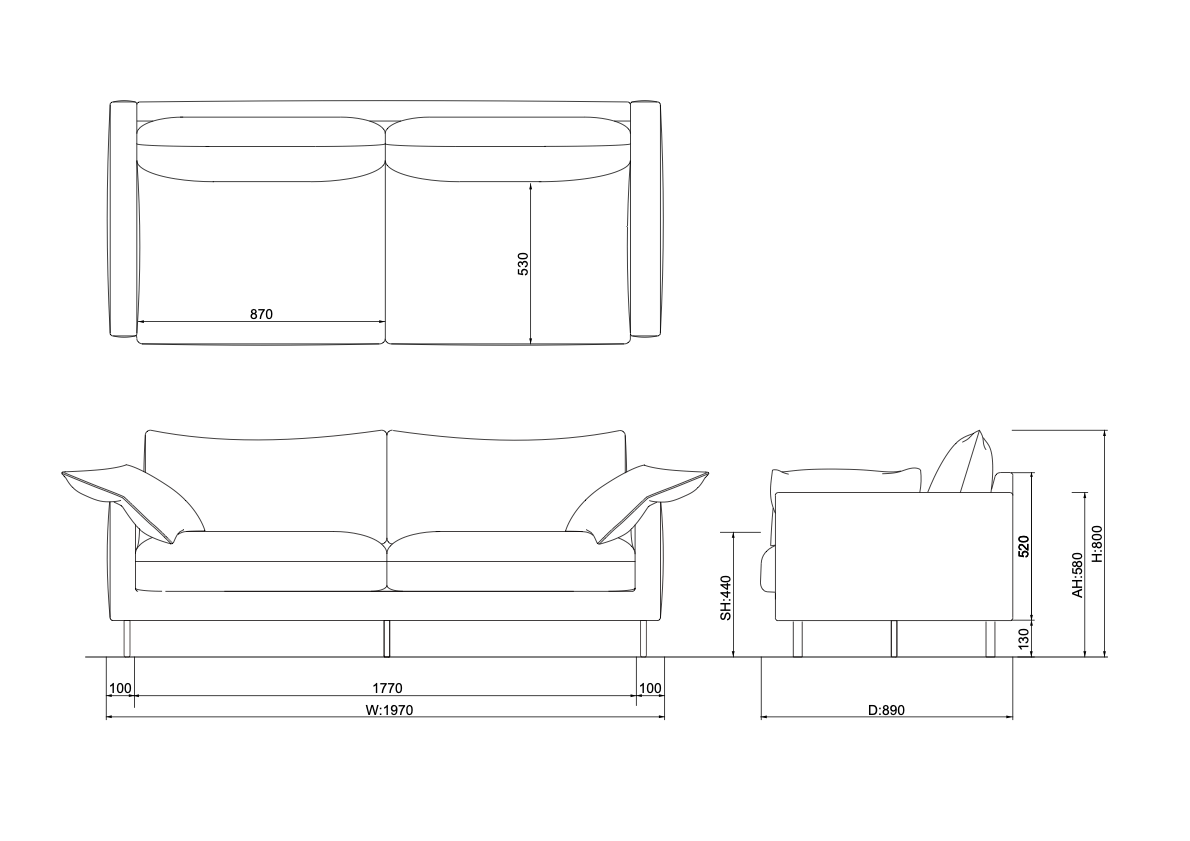 - 幅197cm x 奥行89cm x 高さ80cm(座面高さ44cm)